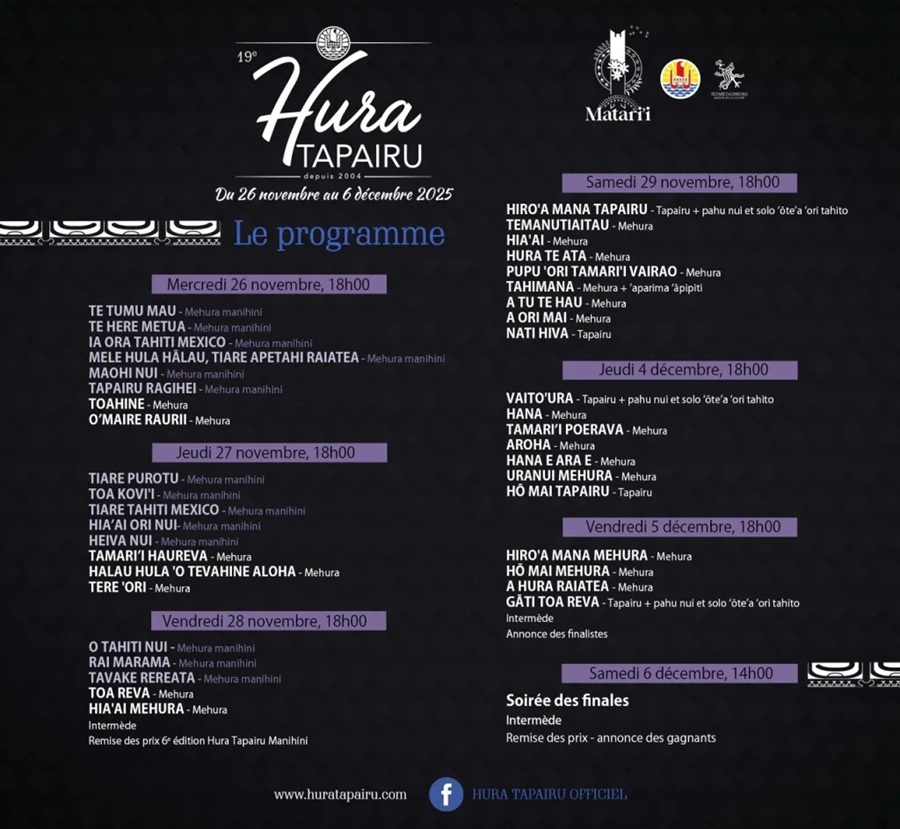 フラ・タパイルは、ヘイバ・イ・タヒチに次いでフランス領ポリネシアで2番目に人気の高いダンスコンテストです。ヘイバ・イ・タヒチより伝統的な要素の少ない振り付けを特徴とするコンテストで、モダンな音楽や衣装の斬新さがポリネシアの人々に高く評価されています。海外や日本からのタヒチアン・ダンスチームも、コンテストに参加するためにタヒチ島にやってきます。